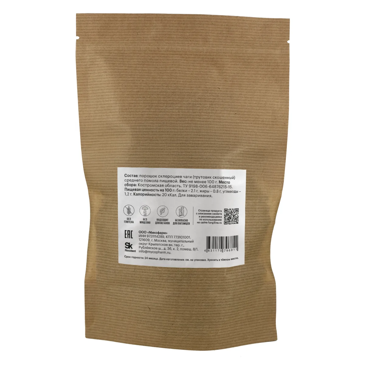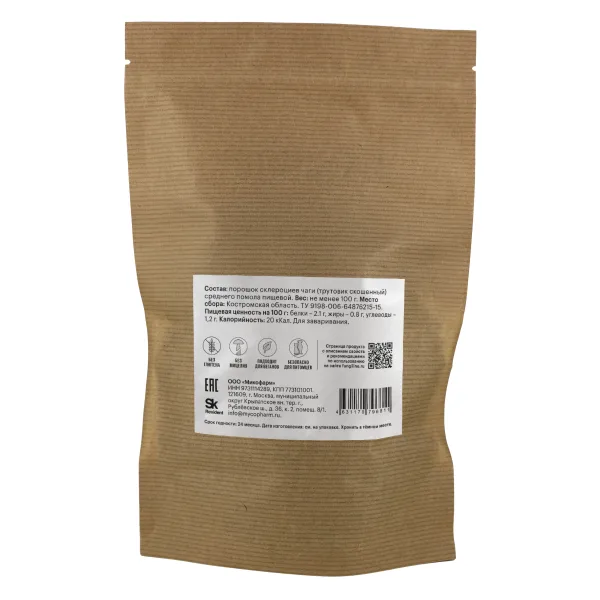 Срок годности — до 26.03.2027; Место сбора чаги — Костромская область; При заваривании 3х столовых ложек чаги в термосе объёмом 1 л, после 10ти часового настоя, получается насыщенный напиток, напоминающий чай; Товар — понравился; Спасибо производителю/магазину за возможность приобретать отечественный суперфуд (функциональное назначение — укрепление иммунной системы).